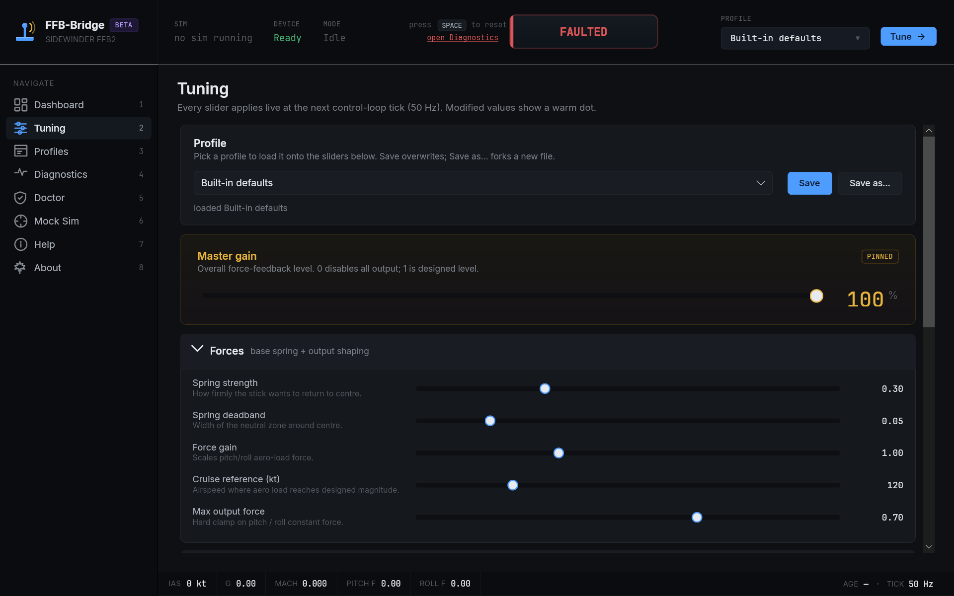Every value is local: no servers, no telemetry. Dial them in from the Tuning page, save as a named profile per aircraft.